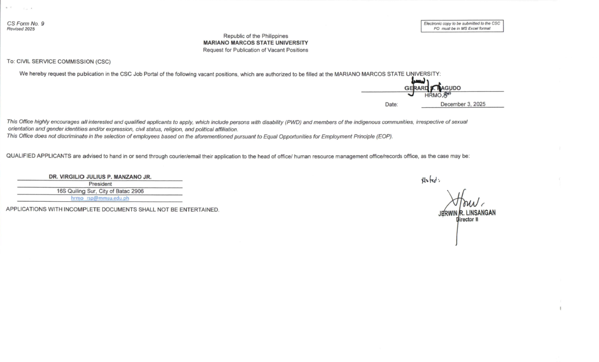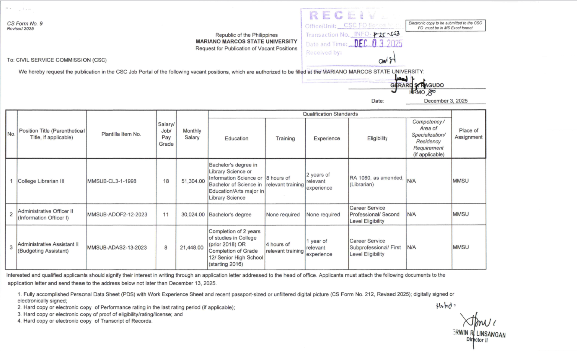 Publication of Vacant Positions (September 15, 2025)
