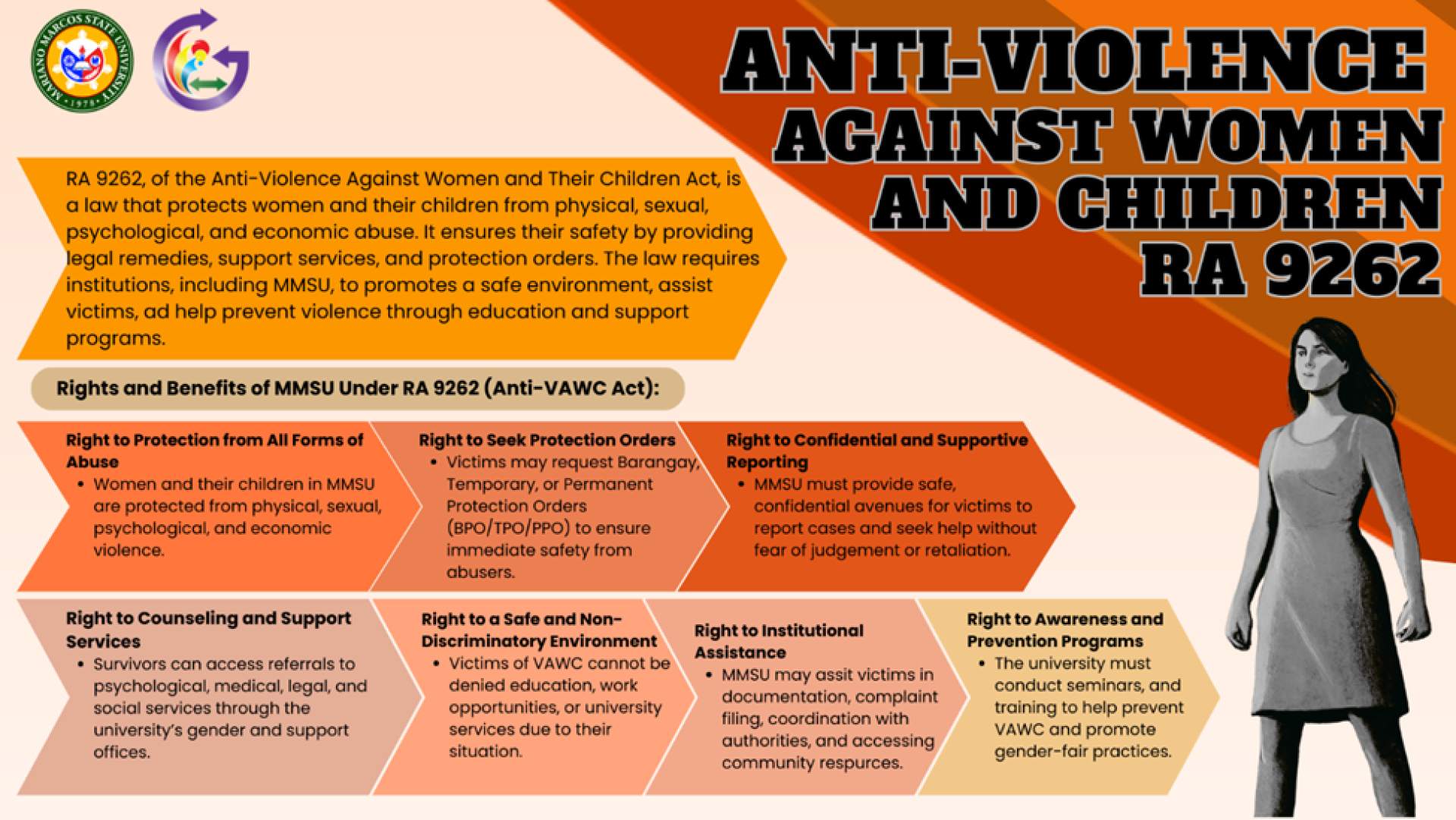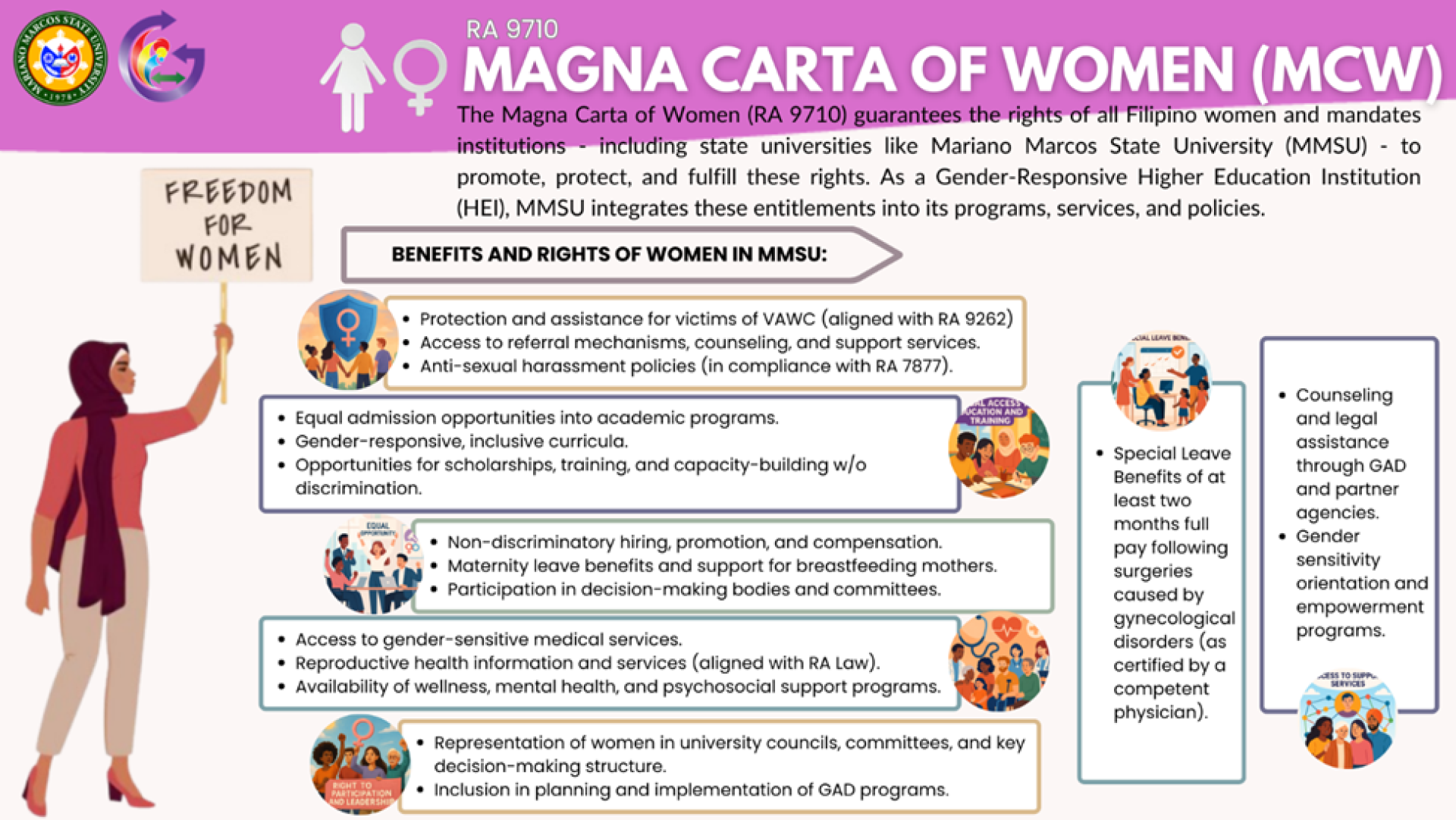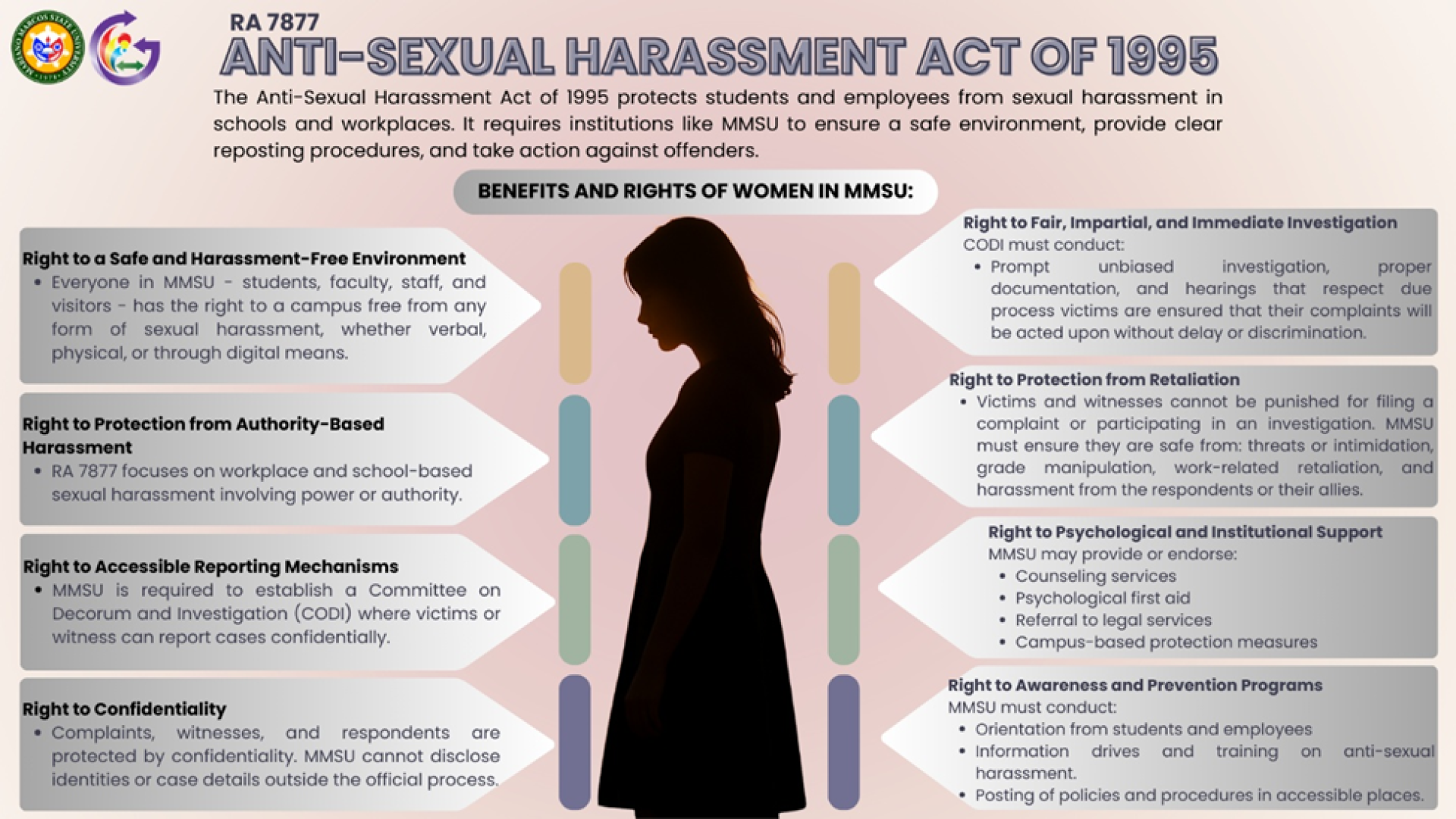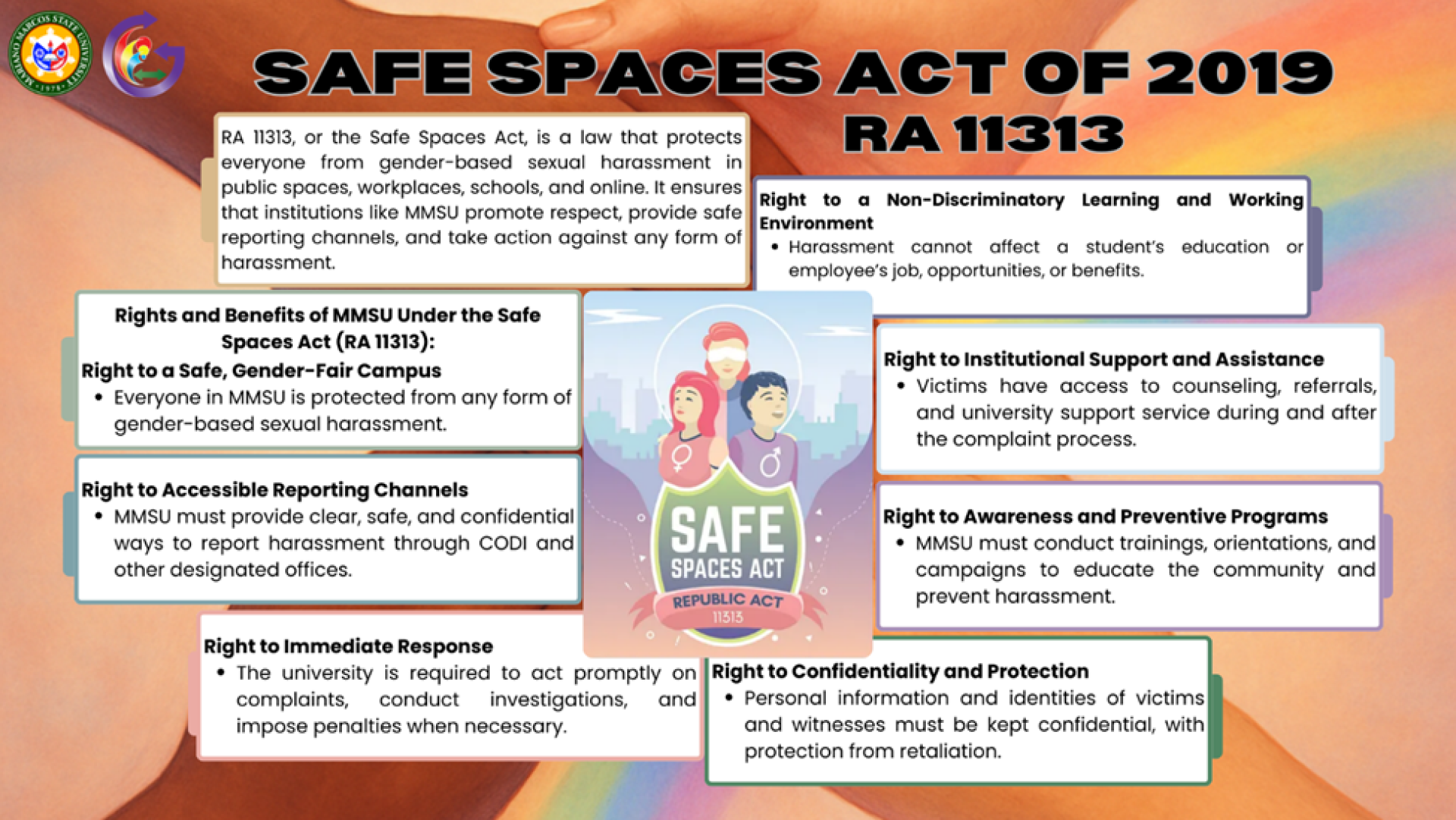 Anchored in key national GAD laws – such as Magna Carta of Women (RA9710), Anti-Sexual Harassment Act (RA 7877), Safe Spaces Act (RA 11313), and other gender-responsive issuances – this MCS ensures that MMSU students and employees are provide with a safe, inclusive, and gender-fair environment; accessible support services and protection mechanisms; equal opportunities for participation and development; and strengthened safeguards against all forms of gender-based discrimination, harassment, and violence.